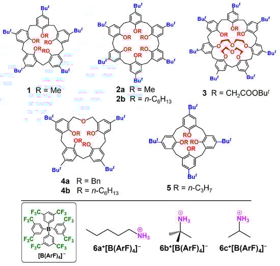 In 2010 [24], our group showed that conformationally mobile hexamethoxycalix[6]arene macrocycle 2a forms pseudorotaxane complexes via threading with dialkylammonium cations coupled with the weakly coordinating barfate anion (BArF− = tetrakis [3,5-bis(trifluoromethyl)phenyl]borate) (Chart 1). The endo-cavity complexation of linear and branched alkylammonium cations, as barfate salts, was also observed with calix[5]arene 1 [23], doubly bridged calix[7]arene 3 [9], dihomooxacalix[4]arene 4 [25,26], and calix[4]arene 5 [27].