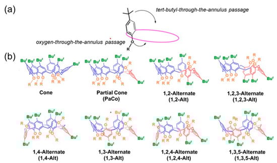 The calix[6]arene macrocycle can adopt eight distinct conformations (Figure 1), including cone, partial cone, 1,2-alternate, 1,3-alternate, 1,4-alternate, 1,2,3-alternate, 1,2,4-alternate, and 1,3,5-alternate [28,29,30], and conformational interconversion between them occurs by means of “oxygen-through-the-annulus” or/and “tert-butyl-through-the-annulus” passage.