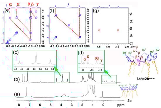 1D and 2D NMR spectra (CDCl3, 600 MHz, 298 K) for the complexation of 6a+ by 2b. (a) 1H NMR spectrum of 2b; (b) 1H NMR spectrum of an equimolar solution of 2b and 6a+[B(ArF)4]− (3 mM); (c,d) enlargements of two different portions of (b); (e,f) portions of the COSY-45; and (g) HSQC spectrum (CDCl3, 600 MHz, 298 K) of the solution in (b).