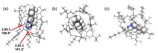 (a–c) Different views of the DFT-optimized structure of the 6a+⊂2bcone complex. (a) Marked in red, +N–H···O, H-bonding mean distance and angle.