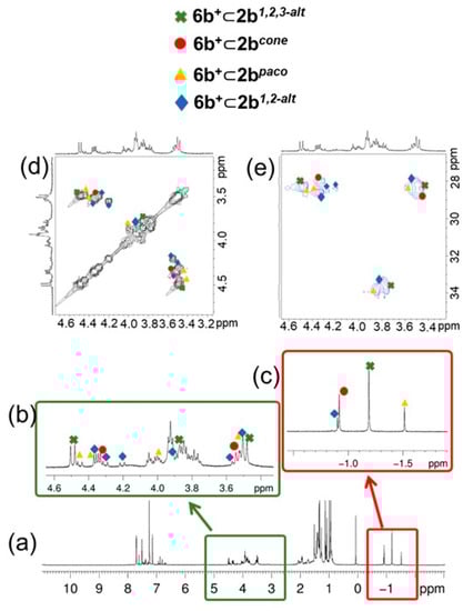 6b+⊂2b1,2,3-alt: The presence of an ArCH2Ar AX system at 3.49/4.49 ppm and an AB system at 3.86/3.77 ppm provides evidence of the 6b+⊂2b1,2,3-alt complex, in which the calix[6]arene adopts a 1,2,3-alternate conformation. The HSQC correlations of these ArCH2Ar signals with carbon resonances at 28.3 and 33.7 ppm (Figure 4e) confirmed the presence of the calixarene host in the 1,2,3-alternate conformation, according to Gutsche’s “1H NMR” rule [28,30] and the “13C NMR single rule” of de Mendoza [29,30]. Finally, the tert-butyl singlet of 6b+ shielded inside the cavity of 2b1,2,3-alt was detected at −1.15 ppm (marked in green), a value significantly up-field-shifted as compared to the analogous signals of 6b+ hosted inside the cone-shaped cavity of 6b+⊂2bcone (−0.92 ppm, marked in red) and the 6b+⊂2b1,2-alt complex (−0.91 ppm, marked in blue) (vide infra).
