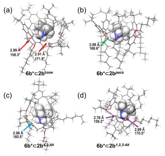 DFT-optimized structures of the complexes 6b+⊂2b1,2,3-alt (a), 6b+⊂2bcone (b), 6b+⊂2bpaco (c), and 6b+⊂2b1,2-alt (d) calculated on the B3LYP/6-31G(d,p) theoretical level.