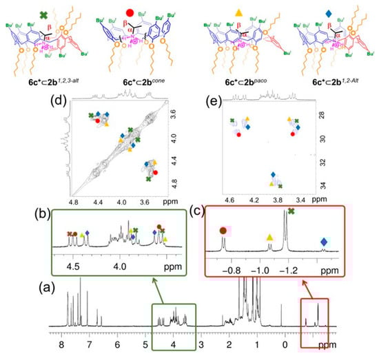 6b+⊂2bcone: The formation of the 6b+⊂2bcone complex was established based on the presence of an AX system at 3.48/4.41 ppm, which correlated in the HSQC spectrum (Figure 6e) with a carbon resonance at 28.0 ppm, attributable to carbon atoms between syn-oriented aromatic rings (red marked in Figure 6).