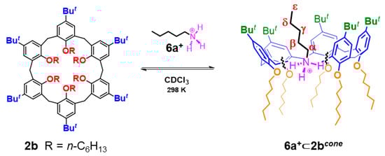 The calculation of the binding constant for the formation of the 6a+⊂2bcone complex through direct peak integration was not possible, as the 1H NMR signals (Figure 2b) of the free 2b and guest 6a+ were not detected in the 1H NMR spectrum of their 1:1 mixture, shown in Figure 2b. Consequently, a binding constant calculation was performed by means of a competition experiment in which 1 equiv of pentylammonium 6a+ was mixed with a 1:1 mixture of 2b and n-butylammonium (in CDCl3) as barfate salt. Previously, we reported on the formation of the n-BuNH3+⊂2bcone complex in CDCl3 with a Kass value of 8.3 ± 0.1 × 106 M–1 [12,13,24,31]. After the mixing of 2b, n-BuNH3+, and 6a+ (1/1/1 molar ratio), the n-BuNH3+⊂2bcone complex was preferentially formed over the 6a+⊂2bcone one in a 1.6:1.0 ratio. Thus, from these data, a binding constant of 5.2 ± 0.1 × 106 M–1 was calculated for the formation of the 6a+⊂2bcone complex in CDCl3 at 298 K (see the Supplementary Materials for further details).