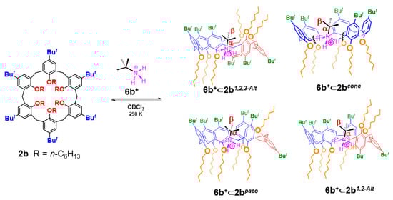 Endo-cavity complexation of tert-butylammonium 6b+ as barfate salt [B(ArF)4]– by 2b: formation of 6b+⊂2b1,2,3-Alt, 6b+⊂2bcone, 6b+⊂2bpaco, and 6b+⊂2b1,2-Alt complexes.