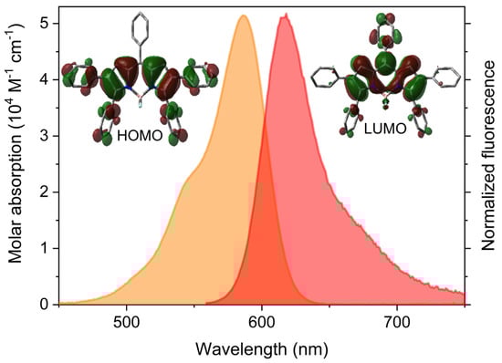 Representative absorption (orange) and fluorescence (red) spectra of the polyphenylBODIPY 4f (see Figure S1 for the spectra of the rest of dyes of this family) in diluted solutions of cyclohexane. The corresponding contour maps of the frontier orbitals are also enclosed.