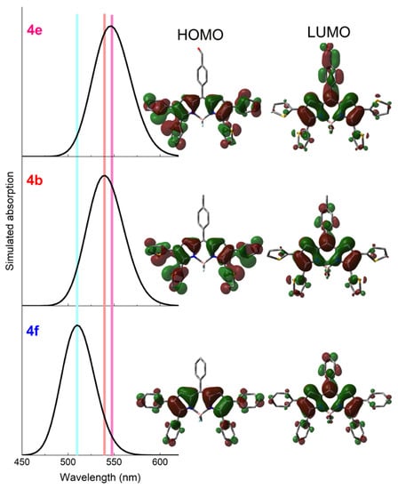 Contour maps of the frontier molecular orbitals calculated from optimized ground state geometries (wb97xd/6-311 + g*) for representative polyphenylBODIPY 4f, and polythiopheneBODIPYs 4b and 4e. The corresponding theoretically predicted absorption spectra (td wb97xd) are also depicted.