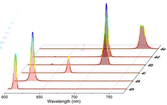 The absence of population of the triplet manifold prompted us to test these extended BODIPYs as photoactive media of tunable organic lasers. All of them show the typical broad dye laser emission (full width at half maximum, FWHM, overall around 5 nm) in the red–NIR edge of the visible, ranging from 600 nm to 760 nm (Figure 5), after being transversally pumped by a wavelength-tunable Optical Parametric Oscillator (OPO), which allows irradiation of each dye at its maximum absorption wavelength (see Section 3 for details). The concentration that optimizes the laser efficiency, understood as the ratio of the output and input (pump) energies, depends on each dye (around 0.5–0.75 mM, Tables S3 and S5). In this sense, the laser output efficiency increases with the concentration up to a maximum plateau, from which it decreases owing to reabsorption/reemission phenomena. The shift of the emission peak to longer wavelengths with the concentration increase backs up this interpretation (Tables S3 and S5). In general terms, the evolution of the laser wavelength correlates well with the fluorescent one (Table 2 and Table 3). Thus, within the polyarylated dyes, 4i, functionalized with methoxy, shows the reddest laser emission (from around 610–635 nm to 670 nm). Alternatively, the laser emission of the BODIPYs functionalized with thiophene is pushed deeper into the red (around 705–715 nm), mainly with the presence of formyl in the 8-phenyl (4e, up to 745 nm), being the reddest one among all the tested laser dyes.