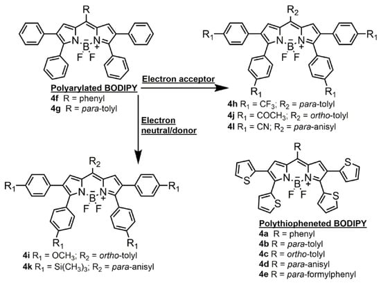- Liu, P.; Gao, F.; Zhou, L.; Chen, Y.; Chen, Z. Tetrathienyl-functionalized red- and NIR-absorbing BODIPY dyes appending various peripheral substituents. Org. Biomol. Chem. 2017, 15, 1393–1399. [Google Scholar] [CrossRef]