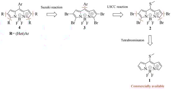 Recently, we reported the synthesis of novel BODIPY building block 2 through a tetrabromination reaction of commercially available 8-methylthioBODIPY 1 and demonstrated that it displayed orthogonal reactivity [32]. The C–S bond was activated under Liebeskind–Srogl cross-coupling reaction (LSCC) conditions, leaving the C–Br bonds intact [33]. This result allowed the selective functionalization of the meso-position leaving the other brominated positions available to be manipulated at will. In this context, we decided to evaluate a quadruple Suzuki–Miyaura cross-coupling reaction to obtain a new family of poly (het)arylBODIPY dyes (Scheme 2).
