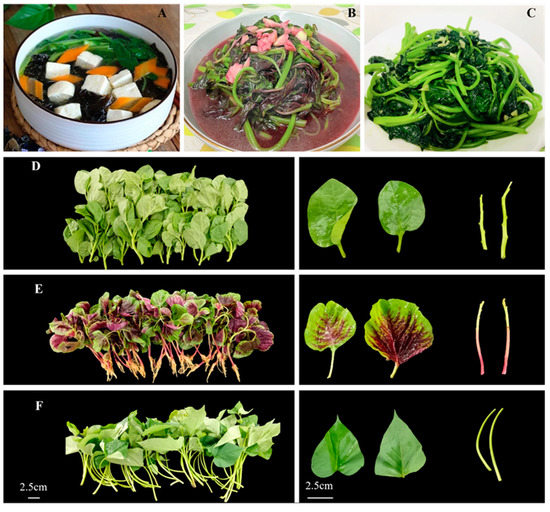 China has eight distinct vegetable growing areas, with the southwest region being the most prominent in terms of vegetable cultivation in the national medium-term genebank of vegetable germplasm resources [1]. Malabar spinach (Basella alba), amaranth (Amaranthus tricolor) and sweet potato (Ipomoea batatas) are three leafy vegetables popular in Southwest China due to their crisp mouthfeel and rich nutritional values. Malabar spinach is an annual twining herb, which belongs to the Basellaceae family. It originated in the tropical regions of Asia, and is also found in Africa and the Americas. Its edible parts include seedlings, tender shoots, and leaves [2,3]. In Southwest China, it is often used in soups to reduce their smooth flavor and enhance palatability among (Figure 1A). Amaranth is native to China, India, and Southeast Asia, among other places [4]. It is extensively cultivated in Southwest China from March to October [5]. Sweet potato is an important crop used for food, animal feed, and as an industrial raw material crop [6,7]. The main edible parts of sweet potato are tubers, but they are also consumed as an important leafy vegetable in Southwest China. Its leaves are also known as “Shao Jian” in Sichuan province. Due to farmers accidentally removing the tips of leaves for cooking during the production of feed, it was discovered that the leaves were palatable. Therefore, more and more people are using sweet potato leaves for cooking. Amaranth and sweet potato leaves are commonly stir-fried with garlic (Figure 1B,C) and pair well with rice, making them very popular among locals. The above three vegetables are widely cultivated as characteristic vegetables of Southwest China.