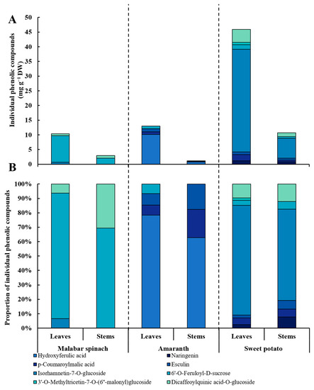Eight kinds of phenolic compounds were detected in the three leafy vegetables, including four phenolic acids, three flavonoids, and one coumarin. Among the three different species, the leaves had a more abundant composition of phenolic compounds compared to the stems. For different species, only three and four phenolic compounds were detected in malabar spinach and amaranth, respectively. All kinds of phenolic compounds were detected in sweet potato except for hydroxyferulic acid. The 6′-O-feruloyl-d-sucrose was detected in all three leafy vegetables. Moreover, the content of total phenolic compounds was also the highest in sweet potato (Table 1 and Figure 4).