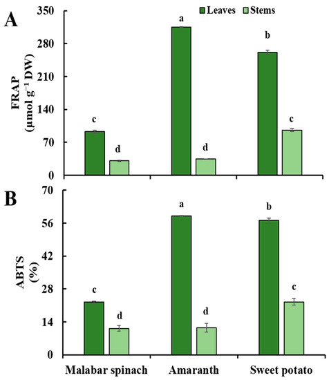 The trends of antioxidant capacity, as measured by two methods (FRAP and ABTS), were similar. The antioxidant capacity in the leaves was higher compared to the stems of all three leafy vegetables. In the leaves, amaranth had the highest level of antioxidant capacity, followed by sweet potato, and malabar spinach had the lowest. In the stems, sweet potato had a higher antioxidant capacity compared to the other two species (Figure 6).