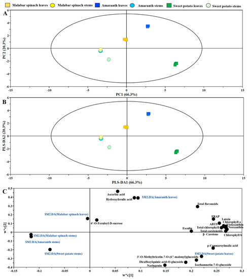 A total of two principal components were obtained in the experiment. The first component (PC1) and second component (PC2) explained 66.3% and 20.3% of the variance, respectively. The leaves of malabar spinach, amaranth, and sweet potato could be discriminated by both PC1 and PC2, whereas the stems of the three vegetables were not clearly discriminated, especially the stems of malabar spinach and amaranth. In addition, the health-promoting compounds and antioxidant capacity of sweet potato were significantly separated from those in malabar spinach and amaranth. However, there was a partial overlap in the health-promoting compounds and antioxidant capacity between malabar spinach and amaranth, indicating a certain degree of similarity (Figure 7A). The results of the PLS-DA was consistent with that of the PCA (Figure 7B). According to the loading (Figure 7C) and VIP (Variable Importance in Projection) plots of the PLS-DA, the major contributors to the sweet potato leaves were p-coumaroylmalic acid.
