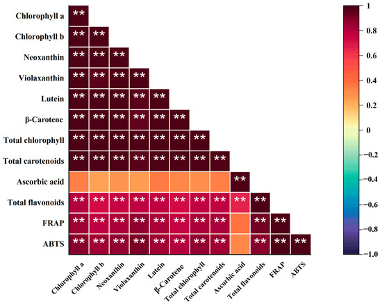 Chlorophyll, carotenoids, total flavonoids, and antioxidant capacity showed significant correlation, with correlation coefficients higher than 0.70. The correlation coefficient between total chlorophyll and neoxanthin was the highest, usually around 1.00. Ascorbic acid exhibited a significant correlation only with total flavonoids, with a correlation coefficient of 0.67 (Figure 8).