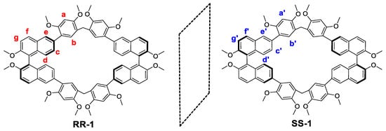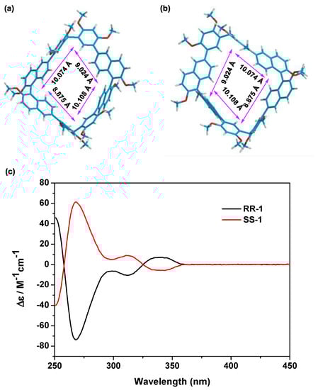 The synthesis of RR-1 and SS-1 isoutlined in Scheme 1. R-3 and S-3 were prepared according to the literature [44]. We then obtained R-2 and S-2 viathe Suzuki coupling reaction of 2,4-dimethoxybenzeneboronic acid with R-3 or S-3 inthe presence of Pd(PPh3)4 as the catalyst in a 68–70% yield. Finally, RR-1 and SS-1 weresynthesized in moderate yield following thetreatment of R-2 or S-2 with paraformaldehyde and boron trifluoride diethyl etherate in dichloromethane at room temperature. The structuresof RR-1 and SS-1 were confirmed by 1H NMR, 13C NMR, as well as HRMS spectra. The CD spectra of RR-1 (black line) and SS-1 (red line) showed mirror images (Figure 2c), providing strong evidence for the handedness of enantiopure macrocycles.