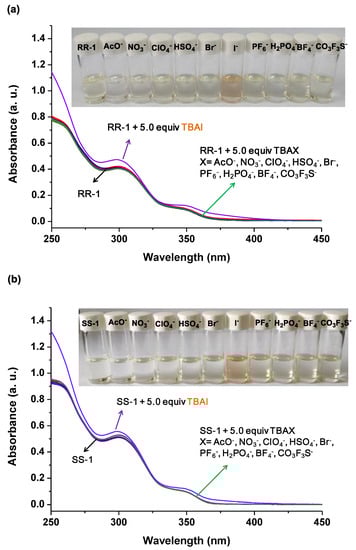 Consequently, UV-vis experiments were carried out to verify our hypothesis and commercially available tetrabutylammonium salts (TBAX) were used as anion sourcesdue totheir simple composition and good solubility in chloroform. As shown in Figure 3a, after the addition of 5.0 equiv. tetrabutylammonium salts (TBAX, X = AcO−, NO3−, ClO4−, HSO4−, Br−, I−, PF6−, H2PO4−, BF4−, and CO3F3S−) to the solution of RR-1 in chloroform, the color of the solution containing RR-1 and TBAI changed from colorless to light orange, whereas the others remained colorless. This obvious color change suggests that interactions between RR-1 and TBAI may have occurred. UV-vis experiments further reveal the interactions behavior between RR-1 and TBAX. Upon the addition of 5.0 equiv TBAI, the absorption at 300 nm and 350 nm was enhanced significantly, and new absorption bands appeared at 375 nm, indicating the formation of RR-1/iodide complexes in the solution. On the other hand, no absorption spectral changes were observed after the addition of other TBAX salts mentioned above. All the above results indicate that RR-1 has the ability toselectively recognize iodide anionsover other tested anions. Similar to RR-1, SS-1 also showedthe selective recognition of iodide anionsover other tested anions (Figure 3b).