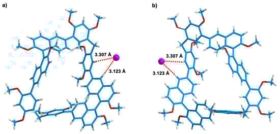 The energy-minimized optimized structure of RR-1/iodide and SS-1/iodide further supported the formation of neutral C–H···anion interactions. As shown in Figure 5a, the iodide anion waslocated outside the cavity of RR-1 through C–H···anion interactions with distances of 3.307 and 3.123 Å, respectively. Only protons b and e corresponding to RR-1 participated in the formation of hydrogen bonds with iodide anions, which is consistent with the results in 1H NMR experiments indicating that only the protons b and e shifted up-field. In the structure of the complex SS-1/iodide, an iodide anionwasalso located outside the cavity of SS-1 through C–H···anion interactions with distances of 3.307 and 3.123 Å, respectively (Figure 5b).