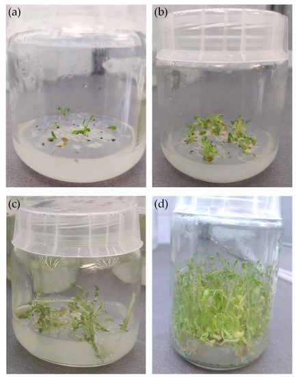 In vitro cultures of Achillea millefolium; (a) establishment of in vitro culture from seeds, (b) in vitro culture seedlings obtained after 1 week; (c) microshoot cultures obtained after a 2-week growth period; (d) microshoot cultures after a 3-week growth period.