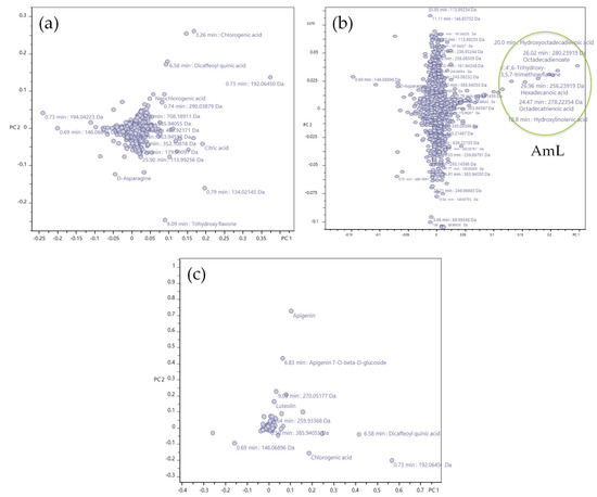 (a) Loadings plot of the principal component analysis (component 1 vs. component 2) covering all H2O extracts from AmIV, AmL and AmH. (b) Loadings plot of the principal component analysis (component 1 vs. component 2) covering all 96% EtOH extracts from AmIV, AmL and AmH. (c) Loadings plot of the principal component analysis (component 1 vs. component 2) covering all the 50% EtOH extracts from AmIV, AmL and AmH; the green circle indicates the presence of fatty acids, being the major difference for AmL extract as compared with AmIV and AmH.