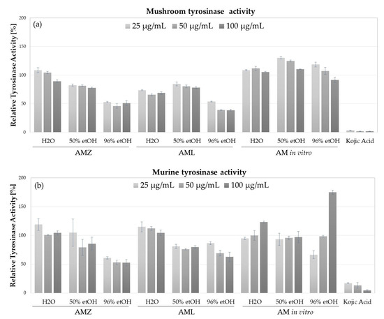 Tyrosinase inhibitory potential was detected in analyzed AmH and AmL extracts (Figure 3). The highest inhibitory activity towards mushroom tyrosinase was detected for 96% EtOH AmH and AmL extracts, decreasing the activity of this enzyme by 50% at the highest tested concentration (100 µg/mL). Inhibition of mushroom tyrosinase was also found for 96% EtOH AmH and AmL extracts (15–23% inhibition) and H2O AmL extract (22% inhibition at 100 µg/mL) (Figure 3a). In respect of murine tyrosinase, contained in the lysate of B16F10 cells, the highest inhibitory potential was measured for 96% EtOH AmH extract (inhibitory rate from 39 to 48% at concentrations from 25 to 100 µg/mL). H2O and 96% EtOH AmL extracts also inhibited murine tyrosinase but to a lower level (38% inhibition at 100 µg/mL of 96% EtOH AmL) (Figure 3b). Interestingly, AmIV extracts prepared in different solvents did not inhibit mushroom or murine tyrosinases but, in fact, increased their activities. Lower tested concentrations (25 and 50 µg/mL) of 50% and 96% EtOH extracts increased mushroom tyrosinase activity by 10–30%. Additionally, 96% EtOH extract at 25 µg/mL inhibited murine tyrosinase by 34% and at 100 µg/mL increased the activity of the murine enzyme by 75%.