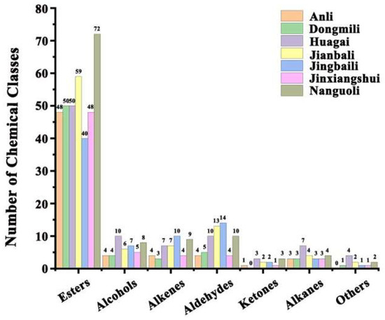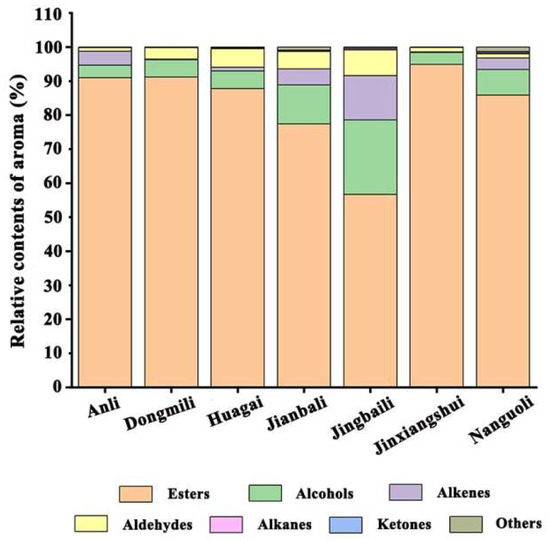 The relative percentages of esters in Anli, Dongmili, Huagai, and Nanguoli ranged from 85% to 91%, while in Jianbali and Jingbaili, these were less than 80%. Dongmili had the second-highest percentage of esters (91.17%) after Jinxiangshui, and the number of ester species was 50. Butyl acetate, ethyl acetate, hexyl acetate, ethyl crotonate, methyl acetate, and heptyl acetate were the main ester components of Dongmili. Heptyl acetate and isobutyl acetate had the highest relative content in Dongmili, according to Figure 4 and Table S1. Anli had a percentage of esters of 90.96%, and the number of species was the same as that of Jinxiangshui. Hexyl acetate, ethyl acetate, butyl acetate, ethyl caproate, methyl caproate, methyl crotonate, methyl acetate, and ethyl butyrate were the main ester components of Anli. The relative content of hexyl acetate was significantly higher in Anli than in the other six types of pears (Figure 4 and Table S1). Huagai had a percentage of esters of 87.80%, and the number of species was the same as that of Dongmili. The primary esters were hexyl acetate, butyl acetate, and (Z)-hex-2-enyl acetate, with the highest relative content of (Z)-hex-2-enyl acetate in Huagai, as shown in Figure 4 and Table S1. Nanguoli had the largest number of ester species at 72, but the relative proportion was 85.87%. The main ester components were ethyl acetate, butyl acetate, methyl acetate, methyl butyrate, ethyl caprylate, ethyl 2-methyl butyrate, hex-2-enyl acetate, and methyl octanoate. The relative contents of ethyl octylate and methyl octylate were the highest in Nanguoli, as shown in Figure 4 and Table S1. Jianbali had a lower proportion of esters (77.42%) and contained 59 esters. The main ester components were hexyl acetate, ethyl acetate, isoamyl acetate, ethyl caproate, methyl acetate, butyl acetate, and propyl acetate. Isoamyl acetate was only detected in Jianbali, as shown in Table S1. Jingbaili had the lowest proportion of esters (56.68%) and the lowest number of species (Figure 3).