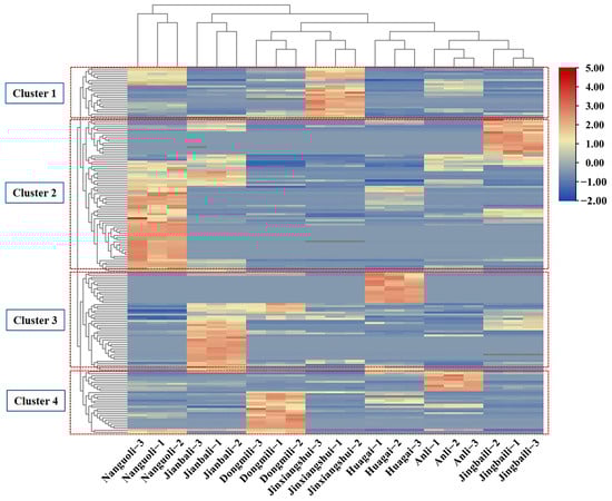 Cluster heatmap analysis of volatile organic compounds in 7 pear cultivars.