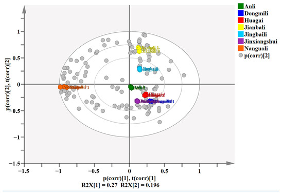 A total of 174 volatile components present in seven types of Pyrus ussuriensis Maxim were analyzed by SIMCA14.1 software. The variance contribution rate, cumulative variance contribution rate and characteristic value of each principal component are shown in Table 1. The results indicate that the six principal components, which had eigenvalues greater than 1 and an accumulative variance contribution rate of 97.0%, reflect all the information of the original variable. Based on the identified aroma substances and their relative content in different types of pears, the seven types were categorized into three groups (Figure 5). The gray spheres in Figure 5 represent the aroma substances, and the closer they are to the hexagon representing the samples, the greater the contribution to sample classification. Table S4 indicates the primary substances contributing to the grouping. Group 1 comprises Jianbali and Jingbaili, which were clustered in the first quadrant, and 2-methylbutyl acetate(E)-2-hexenoic acid methyl ester, diethyl carbonate, (E)-2-hexen-1-ol, ethyl tiglate, and other substances played a crucial role in the grouping. Nanguoli was the only pear type in Group 2, clustered in the third quadrant with some C6 and C9 compounds, such as 2-hexenal, (E)-2-nonenal, 1-nonanol, some unsaturated esters, alkenes, sulfur-containing ester compounds, hexyl ester compounds, and ethyl compounds, such as (Z)-4-decenoic acid methyl ester, limonene, β-myrcene, (E)-β-ocimene, (Z,Z)-α-farnesene, 3-(Methylthio)propanoic acid ethyl ester, hexyl caprylate, and ethyl heptanoate, which significantly affected the separation between Nanguoli and other pear cultivars. Group 3 comprises Anli, Huagai, Dongmili, and Jinxiangshui, clustered in the fourth quadrant, characterized by high concentrations of hexyl acetate, ethyl (2Z)-but-2-enoate, (Z)-hex-2-enyl acetate, ethyl (E)-hex-3-enoate, methyl tiglate, 1-octanol, n-heptanol, and other substances.
