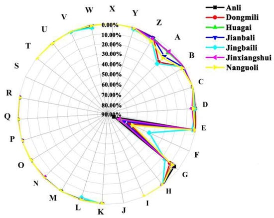 Analysis of aroma characteristic percentage distributions of 7 pear cultivars. Note: A: aliphatic; B: ice; C: citrus; D: dairy; E: edible; F: fruit; G: green; H: herb; I: iris; J: jasmin; K: konifer; L: it-chem; M: muguet; N: narcotic; O: orchid; P: phenol; Q: balsam; R: rose; S: animal; T: smoke; U: animal; W: wood; X: musk; Y: earthy; Z: solvent.