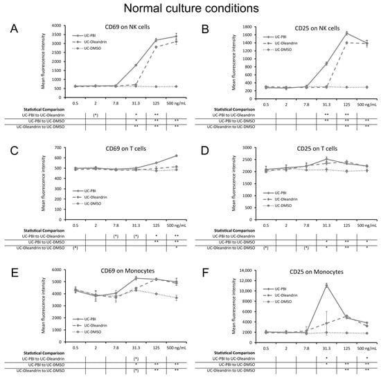Expression of the activation markers CD25 and CD69 on human immune cell subsets from 24 h PBMC cultures under normal culture conditions, where cells were treated with PBI (solid lines), oleandrin (dashed lines), and untreated control cultures treated with matching concentrations of DMSO (UC-DMSO) (dotted lines). (A) CD69 expression on natural killer (NK) cells. (B) CD25 expression on NK cells. (C) CD69 expression on T cells. (D) CD25 expression on T cells. (E) CD69 expression on monocytes. (F) CD25 expression on monocytes. Since both PBI and oleandrin were solubilized in DMSO, a matching concentration range of DMSO served as a solvent control. The results shown are representative of six repeats from different blood donors. For each concentration of a test product, results are shown as the average ± standard deviation of triplicate samples. In the table below the graph, statistical significance at different concentrations is indicated by asterisks, when p < 0.10: (*), p < 0.05: *, p < 0.01: **.