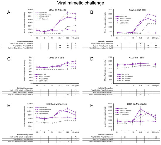 In PBMC cultures challenged with viral mimetic polyinosinic:polycytidylic acid (Poly I:C), cells that were pre-treated with PBI and pure oleandrin before the Poly I:C challenge showed stronger immune activating properties than Poly I:C alone (Figure 2). The expression levels of CD69 and CD25 on Poly I:C challenged NK cells (Figure 2A,B) were strongly upregulated by PBI and oleandrin, reaching a high level of statistical significance at the three highest concentrations (p < 0.01). Although PBI and oleandrin had milder effects on Poly I:C-challenged T cells (Figure 2C,D), the increased CD69 expression was highly significant (Figure 2C) compared to Poly I:C alone (p < 0.01). With both PBI and pure oleandrin, the expression levels of CD69 and CD25 on Poly I:C-challenged monocytes (Figure 2E,F) were upregulated, reaching statistical significance for the 31.3 ng/mL and the 125 ng/mL concentrations, respectively.