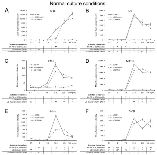 Cytokine levels in culture supernatants from 24 h PBMC cultures under normal culture conditions, where cells were treated with PBI (solid lines), oleandrin (dashed lines), and untreated control cultures treated with matching concentrations of DMSO (UC-DMSO) (dotted lines). (A) Interleukin-1 beta (IL-1β). (B) Interleukin-6 (IL-6). (C) Interferon-gamma (IFN-γ). (D) Macrophage inflammatory protein-1 beta (MIP-1β). (E) Interleukin-1 receptor antagonist (IL-1ra). (F) Granulocyte colony stimulating factor (G-CSF). Since both PBI and oleandrin were solubilized in DMSO, a matching concentration range of DMSO served as a solvent control. The results shown are representative of six repeats from different blood donors. For each concentration of a test product, results are shown as the average ± standard deviation of duplicate samples. In the table below the graph, statistical significance at different concentrations is indicated by asterisks, when p < 0.10: (*), p < 0.05: *, p < 0.01: ** and NC when not calculated.