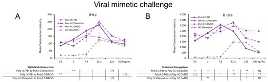 Cytokine levels in culture supernatants from 24 h PBMC cultures under a viral mimetic challenge, where the cells were treated with Poly I:C-PBI (solid lines), Poly I:C-oleandrin (dashed lines), and Poly I:C control cultures treated with matching concentrations of DMSO (Poly I:C-DMSO) (dotted lines), followed by a viral mimetic challenge by polyinosinic:polycytidylic acid (Poly I:C). (A) Interferon-gamma (IFN-γ). (B) Interleukin-1 receptor antagonist (IL-1ra). Since both PBI and oleandrin were solubilized in DMSO, a matching concentration range of DMSO served as a solvent control (Poly I:C-DMSO). The results shown are representative of six repeats from different blood donors. For each concentration of a test product, results are shown as the average ± standard deviation of duplicate samples. In the table below the graph, statistical significance at different concentrations is indicated by asterisks, when p < 0.10: (*), p < 0.05: *, p < 0.01: ** and NC when not calculated.