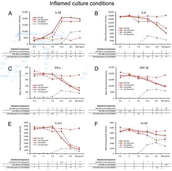 Cytokine levels in culture supernatants from 24 h PBMC cultures under inflamed culture conditions, where the cells were treated with LPS-PBI (solid lines), LPS-oleandrin (dashed lines), and LPS-treated control cultures treated with matching concentrations of DMSO (LPS-DMSO) (dotted lines), followed by an inflammatory challenge by lipopolysaccharides (LPS). (A) Interleukin-1 beta (IL-1β). (B) Interleukin-6 (IL-6). (C) Interferon-gamma (IFN-γ). (D) Macrophage inflammatory protein-1 beta (MIP-1β). (E) Interleukin-1 receptor antagonist (IL-1ra). (F) Granulocyte colony stimulating factor (G-CSF). Since both PBI and oleandrin were solubilized in DMSO, a matching concentration range of DMSO served as a solvent (LPS-DMSO). The results shown are representative of six repeats from different blood donors. For each concentration of a test product, results are shown as the average ± standard deviation of duplicate samples. In the table below the graph, statistical significance at different concentrations is indicated by asterisks, when p < 0.10: (*), p < 0.05: *, p < 0.01: **.