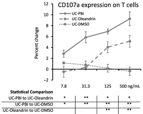 Peripheral blood mononuclear cells exposed to PBI and the pure compound oleandrin showed strongly enhanced cytotoxic killing activity against the MHC class-I deficient target cell line K562, using the gold-standard flow cytometric assay for CD107a expression. The increased expression of CD107a on PBI-treated T cells was highly significant (p < 0.01) when compared to matching concentrations of DMSO across the concentration range of 31.3–500 ng oleandrin/mL (Figure 6). The milder increase seen for oleandrin-treated T cells was only seen for the two highest concentrations of 125 and 500 ng oleandrin/mL, reaching a high level of statistical significance (p < 0.01). This shows that other components in the botanical PBI extract contribute to the effects on innate immune activation.