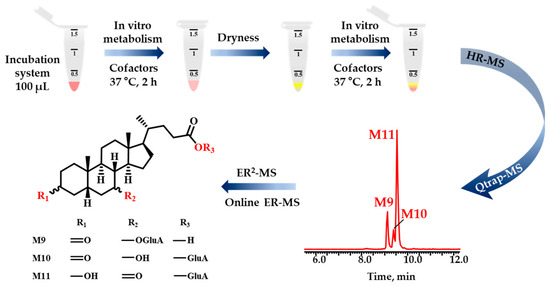 The workflow comprising three primary steps was proposed. Firstly, UDCA underwent sequential metabolism in vitro in a NADPH incubation system. The phase I metabolic products served as substrates for phase II metabolism after being evaporated to dryness with nitrogen. Secondly, the structural characterization of metabolites, even the minor ones, was accomplished by combining HR-MS with Qtrap-MS. Thirdly, the ER2-MS strategy was employed for structural identification of those isomers.
