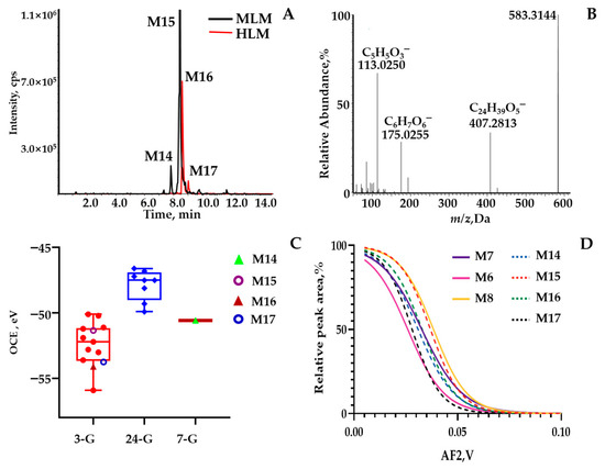 (A) Extracted ion current chromatogram (m/z 583.3 > 407.3) from LC−pMRM program; (B) MS2 spectrum of the quasimolecular ion ([M − H]−) of M15 acquired by LC−MS; (C) Box plot for the OCE scattering pattern of m/z 583.3 > 407.3 against different glucuronidation sites (C-3, C-7, or C-24) via assaying literature in our group; (D) Overlaid sigmoid-shaped second-generation breakdown graphs (relative intensity of 50% against AF2 values) acquired by programming m/z 583.3 > 407.3 > 407.3 for M6–M8 and M14–M17.