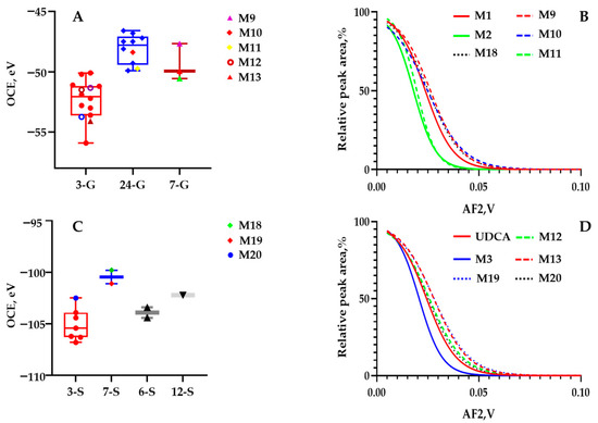 (A) Box plot for the OCE scattering pattern of m/z 565.3 > 389.3 and m/z 567.3 > 391.3 against different glucuronidation sites (C-3, C-7, or C-24) via assaying authentic compounds in our group; (B) Overlaid sigmoid-shaped second-generation breakdown graphs (relative intensity of 50% against AF2 values) acquired by programming m/z 389.3 > 389.3 > 389.3 for M1 (red curve; equation: Y = 100/(1 + 10^((0.02379−X) × −64.11))), R2 = 0.9862), M2 (green curve; equation: Y = 100/(1 + 10^((0.01802−X) × −79.94))), R2 = 0.9865), m/z 565.3 > 389.3 > 389.3 for M9 (red dotted curve; equation: Y = 100/(1 + 10^((0.02630−X) × −56.85))), R2 = 0.9864), M10 (blue dotted curve; equation: Y = 100/(1 + 10^((0.02491−X) × −48.96))), R2 = 0.9875), M11 (green dotted curve; equation: Y = 100/(1 + 10^((0.01962−X) × −92.44))), R2 = 0.9672), m/z 469.3 > 97 > 97 for M18 (black dotted curve; equation: Y = 100/(1 + 10^((0.01962−X) × −92.44))), R2 = 0.9672); (C) Box plot for the OCE scattering pattern of m/z 469.3 > 97 and m/z 471.3 > 97 against different sulfated sites (C-3, C-6, C-7, or C-12) via assaying literature in our group; (D) Overlaid sigmoid-shaped second-generation breakdown graphs (relative intensity of 50% against AF2 values) acquired by programming m/z 391.3 > 391.3 > 391.3 for M3 (blue curve; equation: Y = 100/(1 + 10^((0.02077−X) × −76.97))), R2 = 0.9630), m/z 571.3 > 391.3 > 391.3 for M12 (green dotted curve; equation: Y = 100/(1 + 10^((0.02576−X) × −53.30))), R2 = 0.9764), M13 (red dotted curve; equation: Y = 100/(1 + 10^((0.02794−X) × −52.25))), R2 = 0.9892), m/z 471.3 > 97 > 97 for M19 (blue dotted curve; equation: Y = 100/(1 + 10^((0.02812−X) × −49.78))), R2 = 0.9951), and M20 (black dotted curve; equation: Y = 100/(1 + 10^((0.02516−X) × −55.55))), R2 = 0.9391).