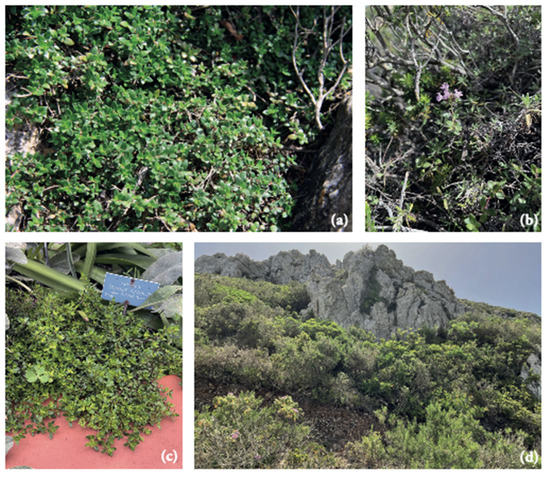 The habitus of Thymus richardii subsp. nitidus (a); inflorescence with purplish flowers (b); T. richardii subsp. nitidus in the collection of Palermo Botanical Garden (c); the rocky habitats at Punta Madonnuzza on Marettimo Island (d).