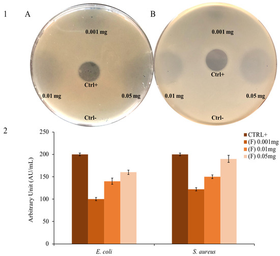 Bacterial growth inhibition: panel (1) shows the inhibition halo of (F) against (A) E. coli and (B) S. aureus. The positive control is ampicillin; panel (2) shows the inhibition halo expressed in AU/mL.