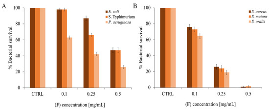 Minimal Inhibitory Concentrations (MICs) of (F) against the Gram-positive and Gram-negative strains were determined according to the microdilution method established by the Clinical and Laboratory Standards Institute (CLSI) [96]. Five samples of 105 CFU/mL were added to 95 µL of Mueller-Hinton broth (CAM-HB; Difco), supplemented or not with various concentrations (0.1–0.5 mg/mL) of (F). After overnight incubation at 37 °C, MIC100 values were determined to be the lowest concentration responsible for the lack of bacterial growth.