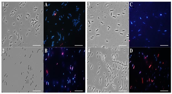 Fluorescence microscopy images. Panels show S. aureus bacterial cells. Panels (1–4) obtained from optical microscope images, and (A–D) from fluorescence microscope images. Untreated bacterial cells (1,A); cells treated with (F) (2,B); cells treated with β-bisabolene (3,C); cells treated with thymol (4,D).