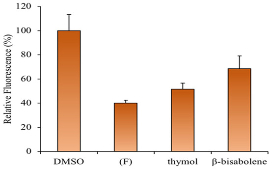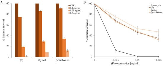 Determination of the antibiofilm activity. Panel (A) shows the percentage of antimicrobial activity determined by (F), β-bisabolene and thymol against S. smegmatis. Panel (B) shows the percentage of M. smegmatis biofilm formation. Different concentrations of (F), β-bisabolene and thymol were tested (x-axis). DMSO is the negative control, and kanamycin is the positive control. The assays were performed in three independent experiments. Standard deviations are always less than 5%.