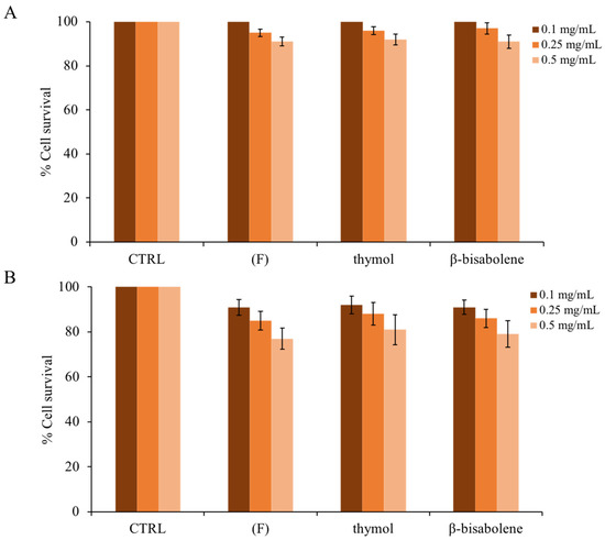 To verify whether the EO of thyme and the compounds found within it could be toxic to eukaryotic cells, human keratinocytes were used to perform an assay using the MTT reagent, as reported in the methods. As shown in Figure 8A (4 h exposure to compounds), even at the maximum concentration (0.5 mg/mL), the compounds are not cytotoxic. Increasing the exposure time to 24 h at the maximum concentration (panel B), the compounds begin to exert a slight cytotoxic effect [49]. Thus, it is possible to conclude that under the experimental conditions used, (F) is non-toxic to this cell line. Similar results were observed in a study in which the EO of the thymus presented antimicrobial activity against several microorganisms, including Pseudomonas aeruginosa, Proteus vulgaris, Citrobacter koseri, and Klebsiella pneumoniae [83]. According to our observations, the EO of thyme does not affect HaCaT cell viability.