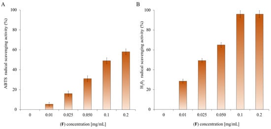 Determination of the antioxidant activity of (F). Panel (A) shows the abatement activity of ABTS radicals reported as % of ABTS removed with respect to the control. Panel (B) shows the hydrogen peroxide scavenging activity reported as % of H2O2 removed relative to the control. The data are the mean of three independent experiments. Standard deviations are always less than 10%.