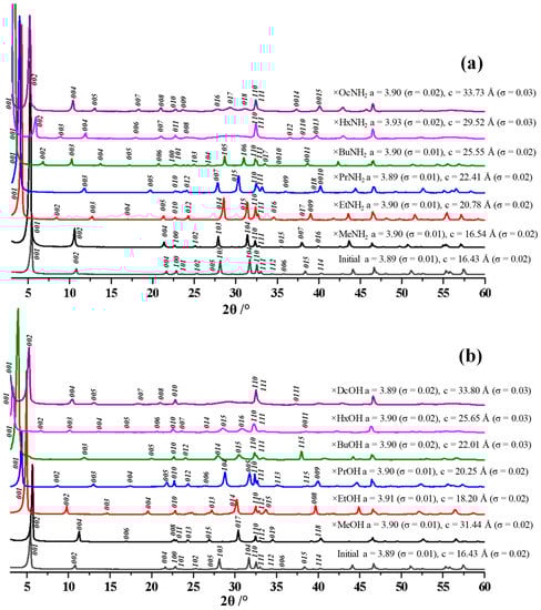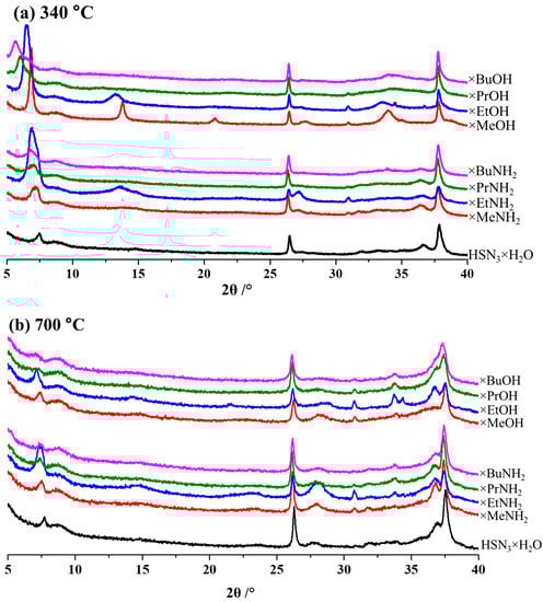 In the case of the alcohol derivatives (Figure S4f–i), however, the increased stability was observed and XRD patterns do not significantly change upon heating up to 280 °C (except for the n-propanol derivative, for which heating to 100 °C causes noticeable structural changes, most likely associated with the release of interlayer water. This was also observed for the ethylamine derivative). A further increase in temperature leads to the formation (based on the analysis of the position of intense reflections in the small-angle region) of phases containing residual alkyl organic chains, which remain in the interlayer space up to the beginning of the oxidation region above 450–500 °C (Figure 5a). The diffraction patterns of the samples heated up to 700 °C (Figure 5b) look approximately the same and correspond to the pyrolysis products of the initial protonated form. This indicates that, as in the case of amine derivatives, there is practically no organic matter left in the interlayer space by that time, which is consistent with the TG data (Figure 6b).