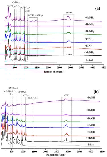 Raman spectra of the initial niobate HSN3·yH2O and its inorganic–organic derivatives with n-amines HSN3 × RNH2 (a) and n-alcohols HSN3 × ROH (b).