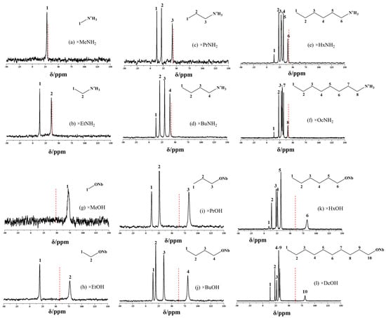 13C NMR spectra of inorganic–organic derivatives with n-amines HSN3 × RNH2 (a–f) and n-alcohols HSN3 × ROH (g–l). The position of the signal from the carbon (1) for the pure liquid amines and alcohols is indicated by a red dotted line.