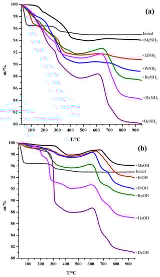 In the case of the protonated form, two main segments can be distinguished on the curve. The first of them, corresponding to temperatures up to 100 °C, refers to the deintercalation of interlayer water molecules with the formation of the anhydrous protonated niobate. In the second section (about 250–600 °C), topochemical dehydration occurs, i.e., the release of protons bound with interlayer oxygen anions. Thus, the final products of thermolysis have an overall formula Sr2Nb3O9,5. The thermal decomposition of organically modified niobates is more complex. It includes the stage of the release of intercalated water and partially amine molecules at relatively low temperatures, the decomposition stage of the hybrid as such (usually near the decomposition temperature of the original protonated form), and the stage of oxidation of residual carbon-containing compounds (accompanied by the weight gain) followed by the complete combustion of residual carbon []. In the case of the inorganic–organic derivatives with methylamine and methanol, increased stability is observed, and the start of decomposition is shifted to higher temperatures, relative to the derivatives with longer chains. Similar behavior was previously observed for other layered oxides [,].