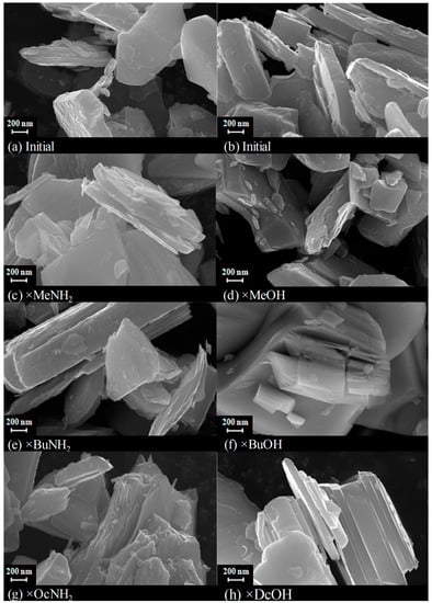 As can be seen from the SEM images (Figure 7), the introduction of organic molecules did not lead to significant changes in the morphology of lamellar particles of the layered oxide. However, for long-chain compounds, such as the decanol derivative, partial delamination of the oxide can be noted.
